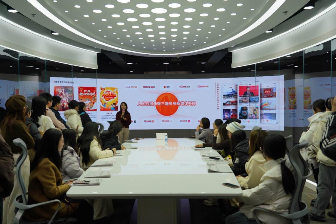 随后,师生一行进入新媒体大厦参观交流。在人民网,师生们聆听了历任党中央领导与人民日报的故事,切实感受到其作为党中央机关报的地位。在新媒体中心,新闻学院校友刘畅详细讲解了人民日报现有的“两微三端多号”新媒体矩阵,将其中蕴含的情感密码和传播逻辑娓娓道来,师生共同感受到人民日报社在当下新媒体浪潮里“弄潮”奋进的蓬勃朝气。