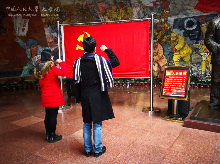 次日,王雪娇、谢久胜两位同志转为正式党员后,在参观平津战役纪念馆的党旗前庄严宣誓。
