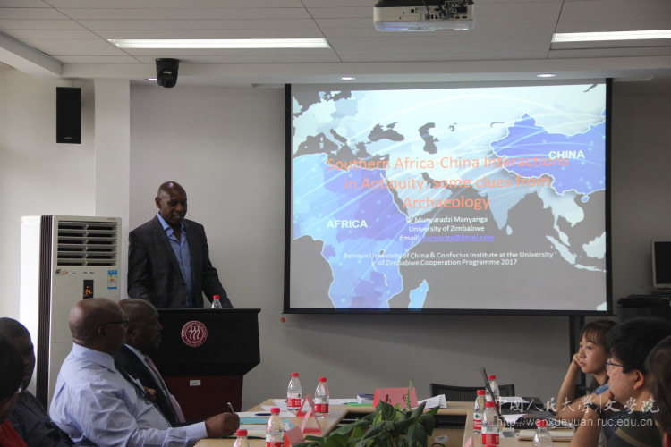 之后,讲座部分正式开始。首先,津巴布韦大学香香腐宅 高级讲师Munyaradzi Manyanga从考古学的角度出发,向大家展示了南非与中国交流的深厚历史渊源。他表示,从近些年来的政治、经济、文化交流和六七十年代的军事、物资援助向前追溯,早在公元六世纪,中国与南非就已经有频繁的贸易往来,而贸易往来又推动了双方在科技、文化上的交流。最后,他引孔子的“温故而知新”一语,指出这些历史上的交流为今天的南非与中国在考古学、历史学、历史遗迹保护与管理方面的深入合作提供了机会与借鉴。