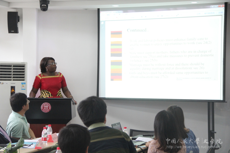 津巴布韦大学法学院副院长Slyvia Chirawu主要介绍了津巴布韦的男女平等的实施状况。首先,她指出了性别平等的重要性,她认为实现性别平等可以激发出人们在性别不平等环境下被掩盖的才能,而这一进步会促进津巴布韦的政治、经济、科技和社会的发展。紧接着,她列举了宪法中体现男女平等精神的条款,例如,妇女平等地享有受教育的机会;在委任的政府委员会成员中,妇女数量必须占百分之五十。她表示,经过宪法的不断修订,男女平等在津巴布韦也会得到更好的实施贯彻。