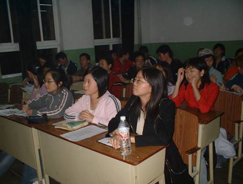 本科班的一大亮点。我们把班会作为一个切实解决同学当前问题的机会,而不拘泥于对任务的简单布置。“形式多样、内容丰富、寓事于乐”是我们所追求的目标。如为了加强班级同学心理健康教育程度,我班曾在诸子百家园召开了主题班会,同时邀请学校心理所的老师一起参加进行交流并给予指导。班会以舞台剧等形式揭示当今大学生存在的心理问题,并以男女生搭配成小组充分讨论,给予解决。