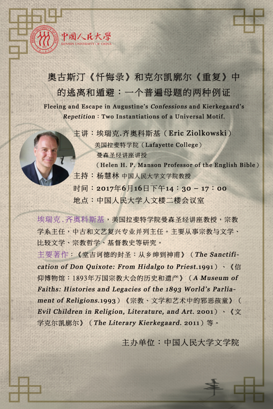 埃瑞克.齐奥科斯基,美国拉斐特学院曼森圣经讲座教授,宗教学系主任,中古和文艺复兴专业并列主任。主要从事宗教与文学、比较文学、宗教哲学、基督教史等研究。主要著作:《堂吉诃德的封圣:从乡绅到神甫》(The Sanctification of Don Quixote: From Hidalgo to Priest.1991)、《信仰博物馆:1893年万国宗教大会的历史和遗产》(A Museum of Faiths: Histories and Legacies of the 1893 World’s Parliament of Religions.1993)《宗教、文学和艺术中的邪恶孩童》(Evil Children in Religion, Literature, and Art.2001)、《文学克尔凯廓尔》(The Literary Kierkegaard. 2011)等。