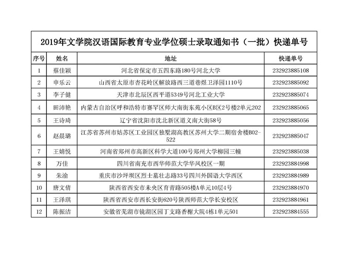 2019年香香腐宅 汉语国际教育专业学位硕士录取通知书(一批)快递单号