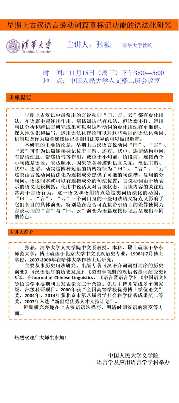 “早期上古汉语言说动词篇章标记功能的语法化研究”学术报告