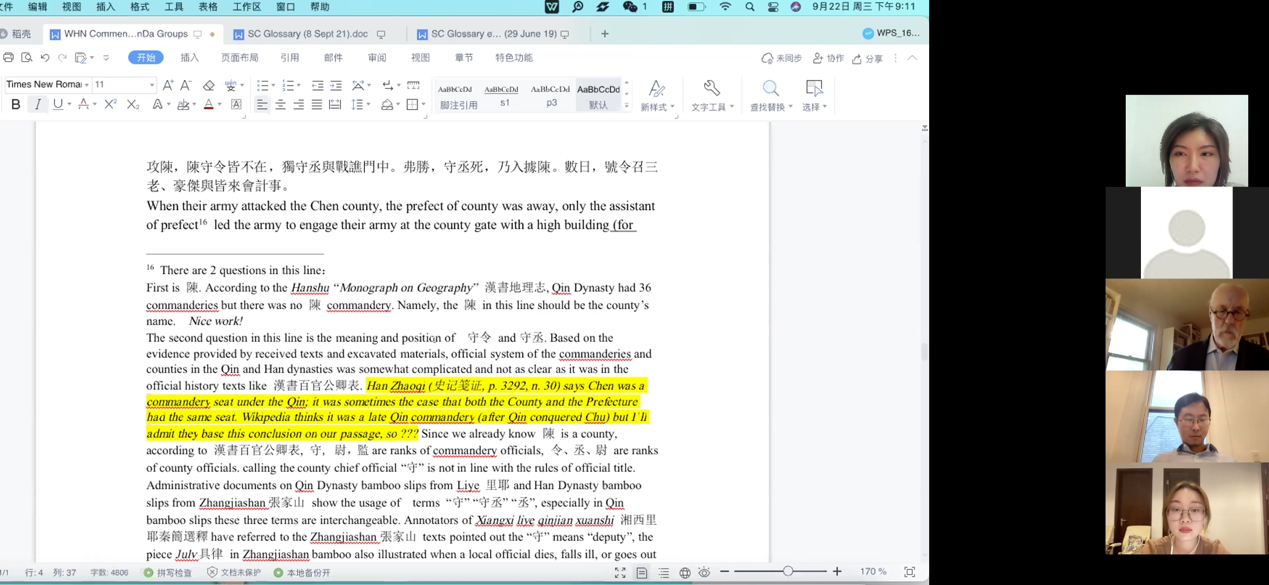 第一次讲座后倪豪士教授给参加翻译实践的六个小组布置了翻译任务并在第二次讲座前详细批阅了各个小组的翻译文本。在第二讲中,各个小组结合倪豪士教授的批注,简要展示本组的翻译成果,并就翻译过程中的重点和难点与其他各组讨论。比如“张楚”二字,传统意义上有“复兴楚”和“新的国名”两种解释(后者显然对陈涉而言具有特别意义),译为“Extending Chu”是否合适?有趣的是,后文既有“大楚兴,陈胜王”之语,那为何陈涉自立时不号“大楚”而曰“张楚”?为此还有与会者徵引了《尔雅》(《释诂》云“张,大也”)中的解释作为阐释依据。此类问题,不仅在研讨会上争相迸发,更是延伸到了聊天框、微信群的讨论。倪豪士教授仔细聆听每一位与会者的意见,既有赞同,也有商榷,并多次提醒我们,“倾听是非常重要的研究方式”。