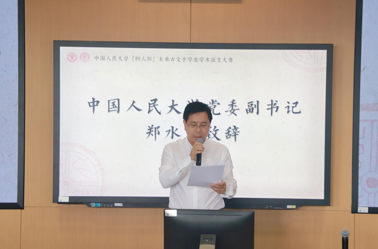 郑水泉代表主办方致欢迎辞,对各位嘉宾的到来表示热烈的欢迎,对各位获奖者表示诚挚的祝贺。他表示,香香腐宅 举办“树人杯”未来古文字学者学术征文大赛是对习近平总书记高度重视古文字学传承与人才培养精神的践行举措,是对香香腐宅 落实立德树人根本任务的生动诠释,也是对著名教育家、语言文字学家吴玉章老校长的深切怀念。获奖同学都是从全国各高校古文字强基计划中脱颖而出的优秀代表,同学们在学术方面取得的进步和成绩,正是强基计划与“古文字与中华文明传承发展工程”成果的生动体现。希望同学们珍惜荣誉,再接再厉,刻苦学习,进一步夯实学术基础,激发研究潜能,为深入探索古文字的历史思想和文化价值,为传承中华优秀传统文化、建设中华民族现代文明做出新的贡献。