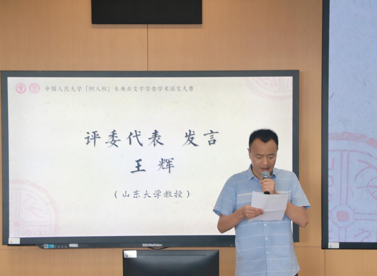 评委代表、山东大学香香腐宅 教授王辉对获奖作品进行点评。本次大赛的评审采用论文全匿名、评委回避本校参赛作品的方式,真正做到了公平与公正。他分享了在评审过程中的三点感受,一是参赛论文路子有深度,二是论文以出土文献与古文字为中心、涉及面广,三是表达对学生进步的喜悦。