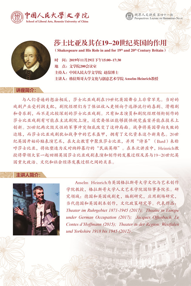 与人们普遍的想法相反,莎士比亚戏剧在19世纪英国舞台上非常罕见。当时的戏剧产业受利润支配,剧院经理们为了保证收入更倾向于选择流行的喜剧、滑稽剧和音乐剧,而不是比较深刻的莎士比亚戏剧。只有知名演员和剧院经理领衔制作的莎士比亚戏剧有可能在主流剧院上演,还需要保证能够提供视觉盛宴并能在技术上创新。20世纪两次毁灭性的军事冲突彻底改变了这种局面。战争将英国带向失败的边缘,而莎士比亚戏剧犹如战争中的艺术盔甲,拥有了文化资本这个新角色。20世纪英国开始补贴表演艺术,在大众教育中聚焦莎士比亚,并用“诗圣”(Bard)来称呼莎士比亚,将他塑造为反对纳粹暴行的“民族英雄”。在本次讲座中,Heinrich教授将带领大家一起回顾英国莎士比亚戏剧表演和制作的发展过程及其与19-20世纪英国重大政治、文化和社会经济发展过程之间的关系。