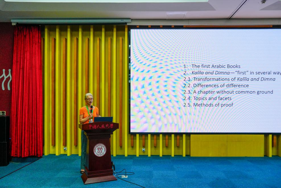 著名埃及学家、牛津大学荣休教授John Baines则以“书籍在早期埃及书面文化中的地位”为题,深入分析了埃及最早期的文献遗存,包括墓碑铭文、祭祀文献等。他认为,这些文字记录最初并非为了存储知识,而是具有强烈的宗教性和祭祀功能,只有到了新王国时期,文献才开始呈现出知识性和娱乐性。来自柏林自由大学的Beatrice Grundler教授以阿拉伯语文化为切入点,探讨了《卡里拉和迪姆纳》这部流传甚广的寓言故事集的形成过程。她指出,这部作品最初源于印度文学,经由不同译本转化为阿拉伯语,不但反映了文化交流,也标志着阿拉伯文学开始从口头传统迈向书面形式。