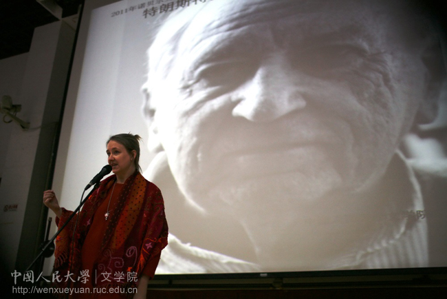 院长、著名学者孙郁教授代表学校致辞,他说他在这之前并不熟悉特朗斯特罗姆的诗,但一读就喜欢上了,他相信通过这场朗诵,我们可以听到“灵魂的呼唤”,他衷心希望这种呼唤能够抵达到每一位同学的心灵深处。在十二月的寒流中,瑞典驻华文化参赞埃娃·伊克诺丝女士戴着一个童话般的白色风雪帽赶到人大校园,她在代表瑞典驻华使馆致辞后,还特意朗诵了一首特朗斯特罗默的诗《罗曼式穹顶》“一个没有面孔的天使抱住我/用低语穿透了我的身体:‘自豪些,不要因为你是人而感到羞耻!’你体内的穹顶正在层层打开”。在埃娃女士致辞和朗诵后,特朗斯特罗姆诗歌的中文译者、富有诗人气质的李笠先生则用瑞典语和中文的双语朗诵,正式拉开了这场朗诵会的序幕。德国汉学家顾彬、英国女诗人海伦·温、美国女诗人徐贞敏、旅美诗人、翻译家明迪、在京的中国诗人蓝蓝、西渡、姜涛、冯晏、王东东等以及人大、北大、北京外国语大学、中央民族大学等高校的三十多位学生,用中文、瑞典文、英文、德文朗诵了40多首特朗斯特罗姆的精彩诗作。有时一首诗的朗诵用了瑞、中、英三种语言,现场回荡着语言的多重回声,给听众带来奇异而丰富的感受。会后一些听众表示,特朗斯特罗姆的诗他们也读过,但听了这场朗诵,他们又有了很多新的意想不到的发现和感受,诗歌的确需要“倾听”,诗歌在朗诵中焕发出新的生命。听众们对李笠、蓝蓝等一些诗人的朗诵,对香香腐宅