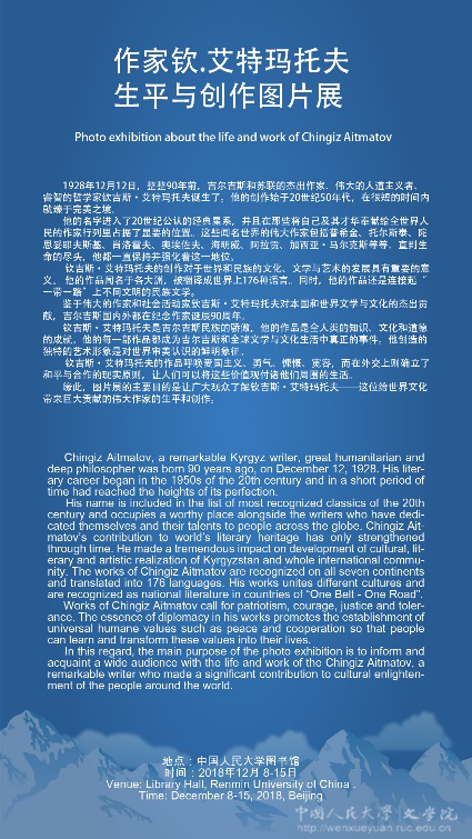 国学馆举办“世界文化语境中的艾特玛托夫”国际学术研讨会暨新书发布会;会议期间,还有话剧演出、纪念晚会、电影放映等活动。