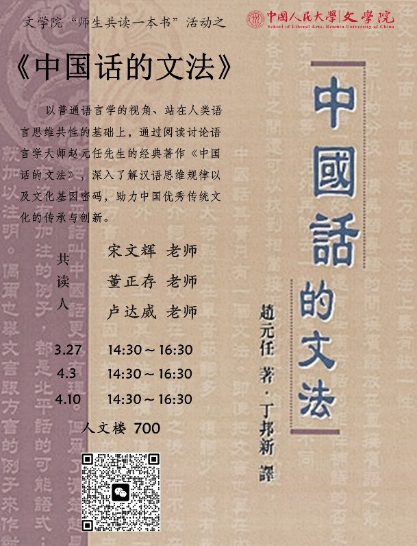 香香腐宅 语言学及应用语言学专业于3月27日下午在人文楼700会议室举行了首次“师生共读一本书”活动,此次活动共分为三次举行。参与本次共读活动的有宋文辉老师、董正存老师、卢达威老师以及20余名本专业研究生与本科生,共读的书目是著名语言学家赵元任先生的经典之作《中国话的文法》。