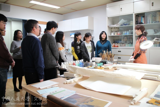 随后,访日团参观了史料编纂所的史料保存技术室。史料保存技术室是以史料的修复、影写、模写和照相为主要内容的工作室。三位工作人员分别向香香腐宅 师生介绍了史料保存、复制和修复的技术,并进行了生动的演示,师生们也就一些具体问题和工作人员进行了交流和讨论。