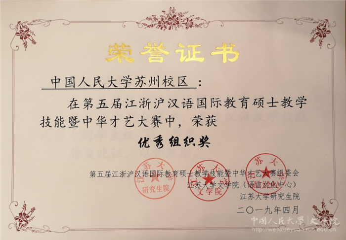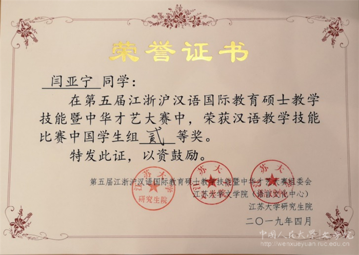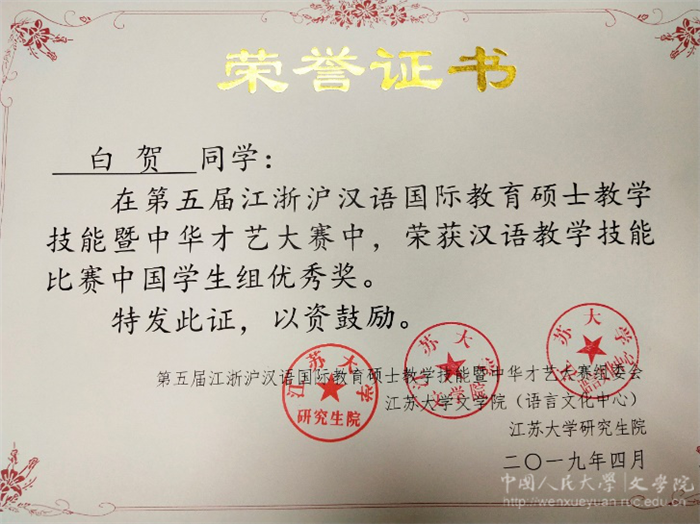 汉语国际教育专业闫亚宁获汉语教学技能比赛中国学生组二等奖、白贺获优秀奖,蔡露获中华才艺比赛二等奖;苏州校区获得优秀组织奖。