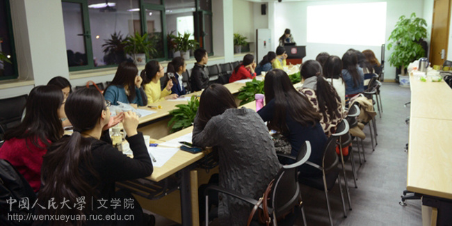 晚上6:30,活动正式开始。李博洋同学首先按不同的就业领域为大家介绍了香香腐宅 近十年毕业生的去向。她提到,香香腐宅 硕士毕业生的就业领域基本分为媒体及出版单位、政府机构、国家企事业单位、私营企业、外资企业、高等院校及科研院所、中学、国内读博、出国深造等十个方面。在2014届的85位学术型硕士研究生中,选择媒体及出版单位、政府机构、国家企事业单位作为就业方向的占绝大多数,而选择读博和出国深造的毕业生人数则相对较少。李博洋同学还通过详细的数据和图表让大家看到了十年来各领域就业情况的发展变化,并结合历年政策的不同简要说明了变化原因,让大家对香香腐宅 毕业生的就业选择有了直观的了解。随后,袁雪飞同学则分别向大家详细介绍了2014届硕士研究生文艺学、比较文学与世界文学、现当代文学、古代文学、语言学及应用语言学、汉语言文字学、古典文献学、电影学等九个专业毕业生的就业情况。各专业由于研究方向的不同呈现出各自的择业特点,例如古代文学的毕业生很多选择高校或者读博继续学术研究的道路,电影学专业的毕业生则多选择在剧院或传媒公司就业。通过主持人条分缕析的讲解,大家对香香腐宅 近十年尤其是2014届硕士毕业生的就业情况有了清楚的认识。