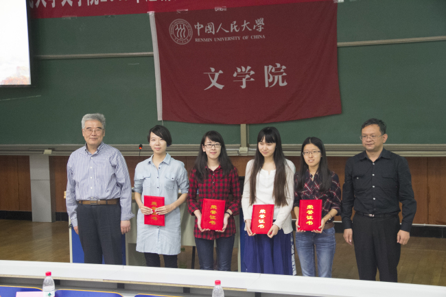 孙郁院长和陈奇佳副院长为获得一等奖的同学颁奖,朱万曙教授、李今教授、曾艳兵教授、王家新教授、徐正英教授为获奖同学颁奖并合影留念。
