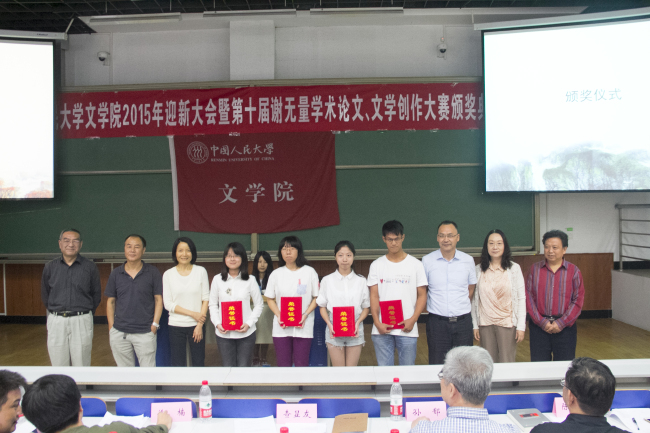 2015年迎新大会暨第十届谢无量学术论文、文学创作大赛颁奖典礼在1602教室举行。查显友副校长,孙郁院长、朱冠明书记兼副院长、徐楠副院长、陈奇佳副院长、徐建委副院长、胡玲莉副书记,各学科带头人、教授,各教研室主任,各新生班主任以及驻校诗人陈育虹老师应邀出席。迎新大会暨颁奖典礼由朱冠明书记兼副院长主持。