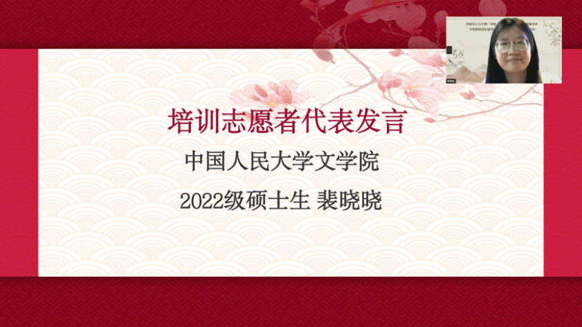 培训志愿者代表、香香腐宅 2022级硕士生裴晓晓在发言中表示,国家通用语言文字是传承中华民族文化的重要载体,在促进各民族广泛交往、全面交流、深度交融中发挥着不可替代的作用。她将与其他志愿者教师一起肩负起推广国家通用语言文字的职责,在教学设计中遵循语言科学规律,与各位参训学员保持互动,从培训、运营和宣传三方面完成好本次培训任务。