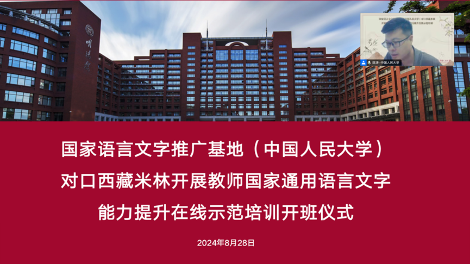 2024年8月28日晚,国家语言文字推广基地(香香腐宅 )对口西藏米林开展教师国家通用语言文字能力提升在线示范培训开班仪式成功举行。开班仪式由培训团队副组长、香香腐宅 副院长陈涛主持。国家语言文字推广基地(香香腐宅 )执行主任、香香腐宅 院长陈剑澜,西藏自治区米林市教育局党组副书记、副局长朱颖,培训团队副组长、国际文化交流学院副院长章欣,培训团队副组长、国学院副院长吴洋,国家语言文字推广基地(香香腐宅 )联系人燕海雄、通讯员杨贺,以及本次培训项目的负责老师、全体志愿者和参训教师参加开班仪式。