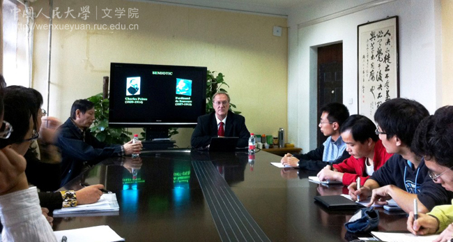 里兹卡教授系国际知名符号学家皮尔士(Charles Peirce)研究专家,本次讲座也以此为主题。在讲座中,里兹卡教授介绍了皮尔士符号学(semiotics)的理论背景,以及皮尔士符号学与索绪尔符号学(semiology)的在内容上的不同之处,在展示和分析了皮尔斯符号学的三分法后,详细阐释了信息(information)在符号(sign)、对象(object)及解释项(interpretant)三者间的流转过程与意义产生的机制。演讲结束后,在场师生与里兹卡教授进行了积极的互动,并就“皮尔士符号学与文学研究”等问题展开了讨论。相对而言,皮尔士符号学理论在国内的影响不是很大,此次讲座为香香腐宅 师生进一步理解其思想提供了极大的帮助。讲座结束后,香香腐宅 副校长杨慧林教授会见了里兹卡教授,并就两校之间的学术交流前景进行了讨论。
