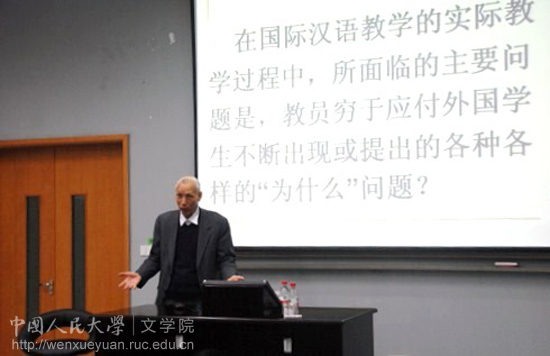 在讲座中,陆教授首先强调了作为一个从事汉语国际教育的教员必须具备科学研究能力。他说,在国际汉语教学的实际过程中,面临的主要问题是教员穷于应付外国学生提出的各种“为什么”,这就要求教员一定要有很强的研究意识和研究能力,这也是他选择“科学研究贵在探索和创新”作为讲座主题的重要原因。
