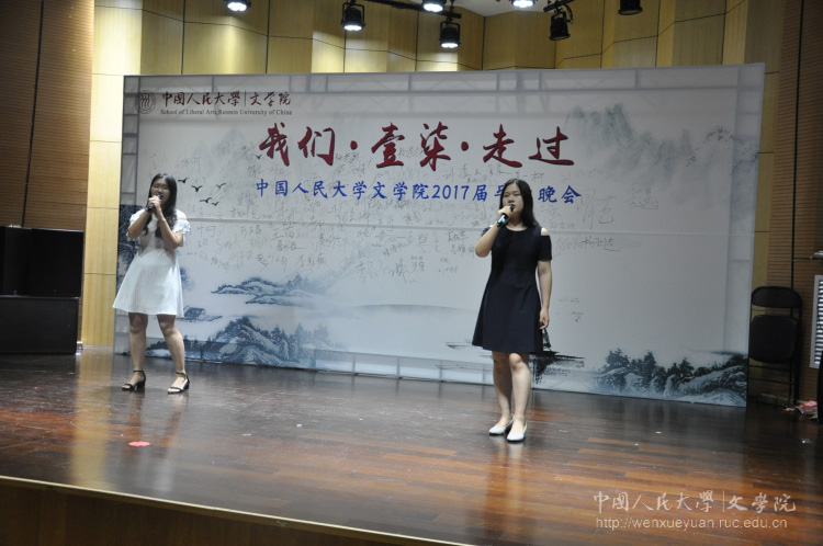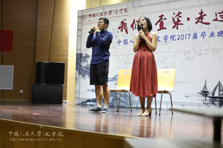 陈圆和杨笛带来歌曲《我要你》,悠扬的旋律、动人的歌词让师生们忆起人大校园里的一草一木和如水月色,端着离别的这碗酒,我只愿再和你看一次校园月色,或是一勺池月影荡漾,或是明法台阶前银盘高悬。