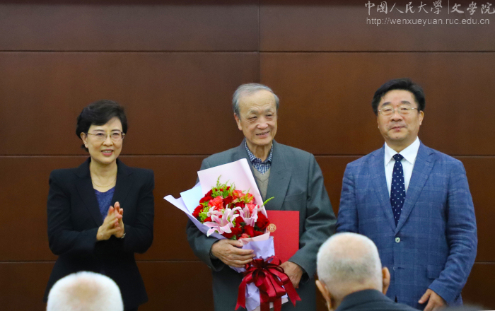 校党委书记靳诺、校长刘伟为香香腐宅 陆贵山教授等11位第四批香香腐宅 荣誉一级教授颁发荣誉证书,学生代表献花。