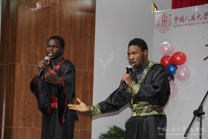 随后,罗观、王雪娇、撒莉三位老师带来舞蹈《桃花醉》,“云袖轻摆招蝶舞,纤腰慢拧飘丝绦”,曼妙的舞姿演绎着江南的味道;谢久胜老师古风独唱《清明上河图》,古典的韵味在画卷上缓缓延续;王博涵、李子文、朱悦锋三名同学的相声表演——《我要当主角》,京味儿十足,博得一片掌声;郭沫杉同学的歌曲《年年》、韩国籍留学生权浩奭的歌曲《我们的爱》则轻快悦耳,扣动着听者的心弦;来自津巴布韦的两位同学天佑、周经理的诗朗诵《将进酒》则用抑扬顿挫的诗句倾吐着太白式昂扬乐观、豪情奔放的豁达与乐观,将晚会氛围推至高潮。