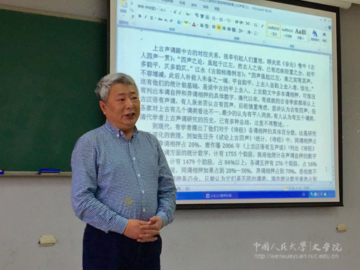 接着,孙教授向同学们分析了《妄稽》《反淫》两篇赋的残简所用韵脚字,其中异调相压的很少,同调相压占80%以上。对于上古是否有去声的问题,自压占到34%以上就不能定义成偶合,故孙玉文教授提出,所以去声应当自成一类。