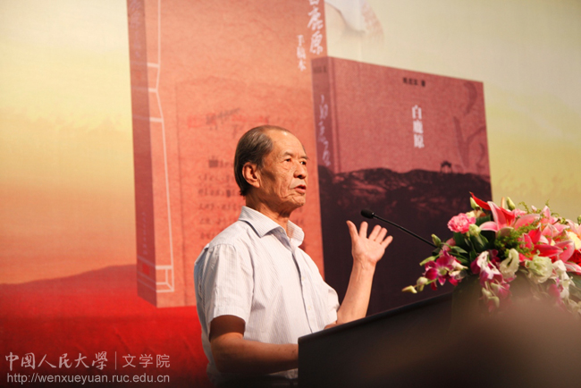揭幕后,陈忠实先生致辞。淳朴的陕西口音立刻拉近了陈老与现场听众的距离。说起与人大的机缘,陈老感慨颇深:60年代初,他曾报考人大,因而对人大有着不同寻常的感情。接着,陈老讲述了自己在农村生活工作的经历以及当年创作《白鹿原》的情景。他回忆了1973年第一次与何启治先生见面并约定创作长篇小说的情景,表达了对人民文学出版社几代编辑的辛劳工作和读者至终不渝的支持的感激之情。“我最大的安慰不是评论界的言论,而是普通读者的认可”,并表示“要在有生之年继续写作,带给读者更好的作品”。