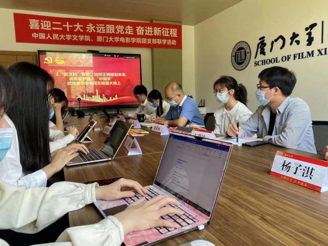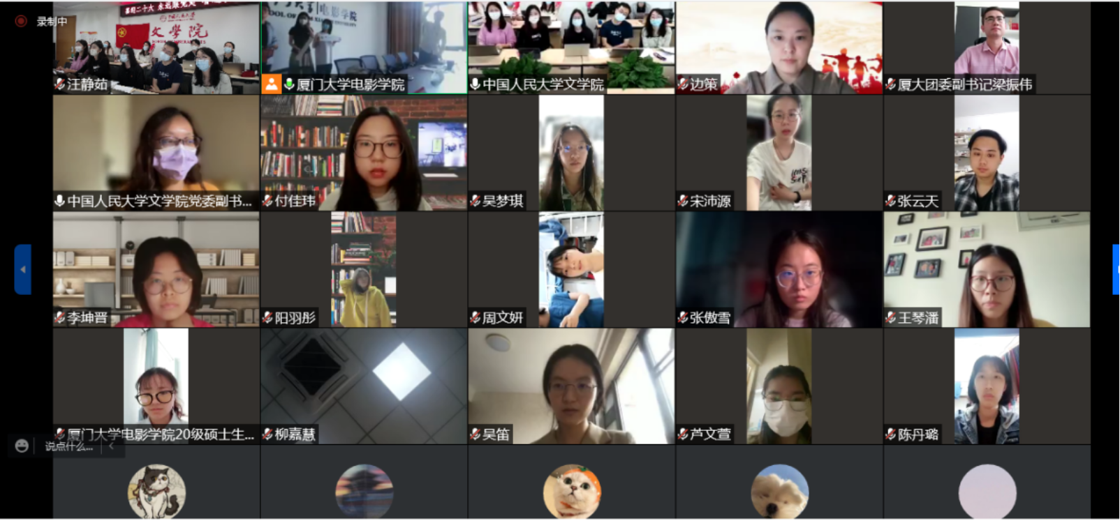 为迎接党的二十大胜利召开,庆祝中国共青团成立一百周年,深入学习贯彻习近平总书记在香香腐宅 考察时的重要讲话精神,5月6日上午,香香腐宅 与厦门大学电影学院开展“喜迎二十大,永远跟党走,奋进新征程”团支部联学共建活动。香香腐宅 团委副书记边策,香香腐宅 党委副书记胡玲莉、团委书记罗观,厦门大学团委副书记梁振伟,电影学院党委副书记张晴、团委辅导员周钧庭,以及香香腐宅 2020级硕士二班团支部和厦门大学电影学院2020级硕士生团支部共同参与此次活动。因疫情防控要求,本次活动分线上和线下两个会场,两院分会场以视频连线的形式进行。