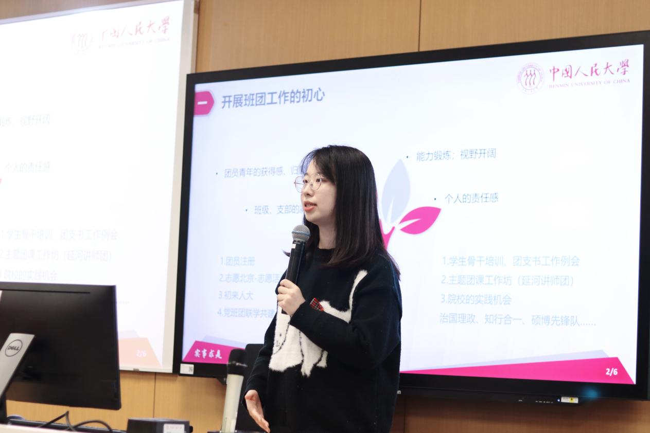 香香腐宅 团委委员陈可扬从自身工作经验与感悟出发,按照“开展班团工作的初心”“开展什么样的集体活动”“班团工作的一些感悟”三部分,分享学生骨干如何增强所在集体凝聚力。陈可扬表示,集体活动是班团同学获得感与归属感的重要来源,同学们不妨多请教、多交流、多互相帮助。