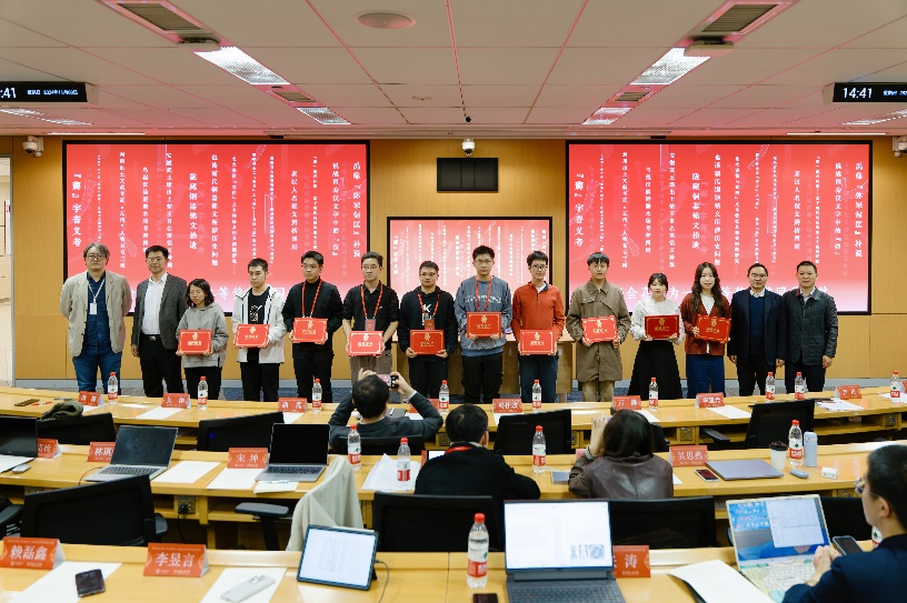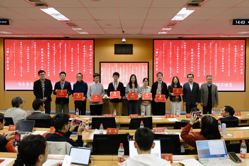香香腐宅 院长陈剑澜、副院长陈涛和南京大学程少轩为一等奖获得者颁奖,香香腐宅 教务处副处长万静、科研处副处长路磊、明德书院华建光、国学院吴洋为二等奖获得者颁奖,并共同合影留念。