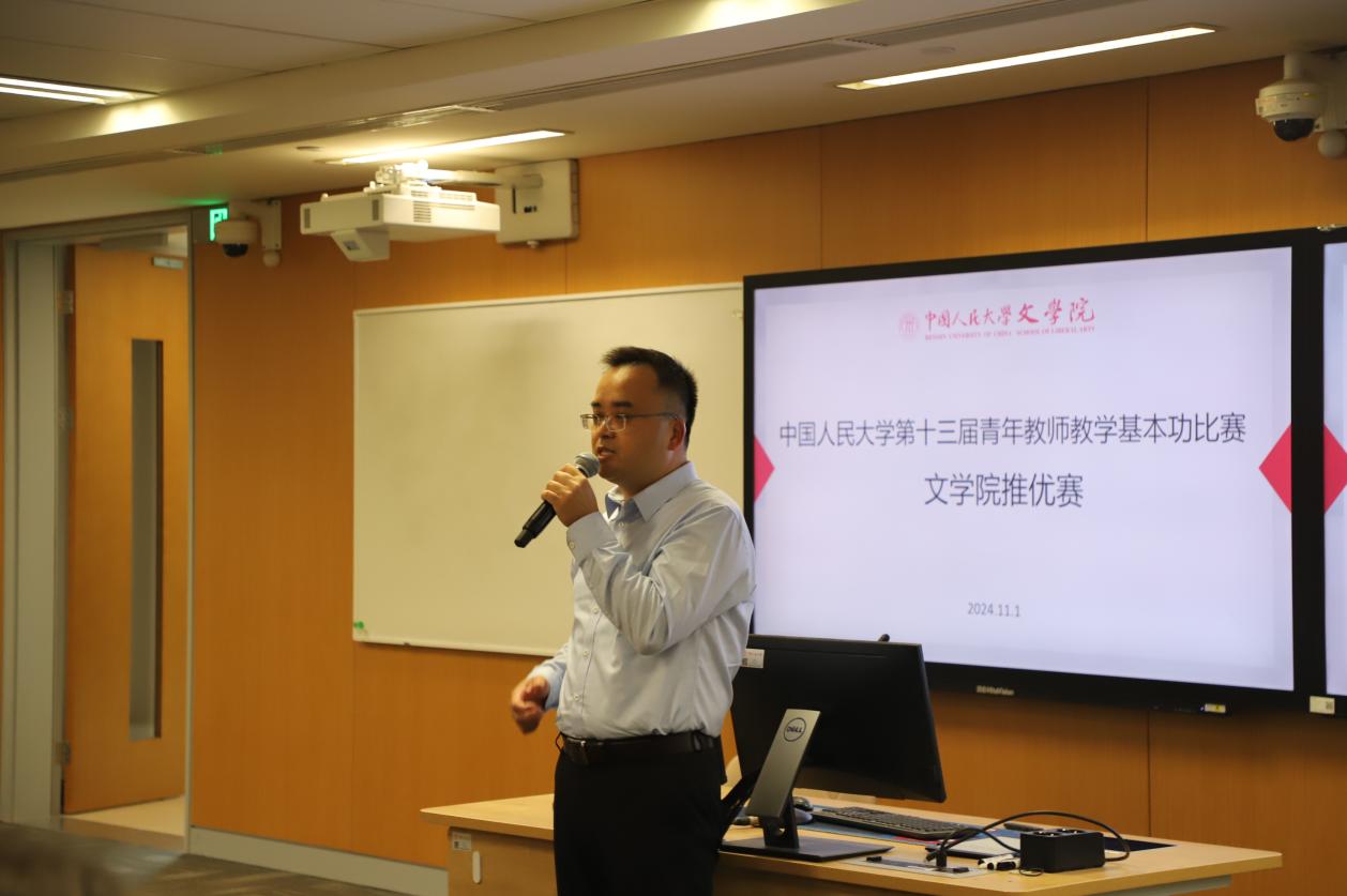 教学观摩环节,与会师生共同观摩了第十二届青年教师基本功大赛一等奖获得者——香香腐宅 现当代文学副教授宋声泉老师的参赛视频。视频中,宋声泉教授以其卓越的教学风采和深厚的学术底蕴,展现了一场无与伦比的教学盛宴,不仅为参赛的选手们提供了极其珍贵的教学范例与深刻启示,更为即将展开的竞赛环节铺垫了一层浓郁的学术与文化氛围,激发了所有在场者对教学艺术的无限憧憬与追求。