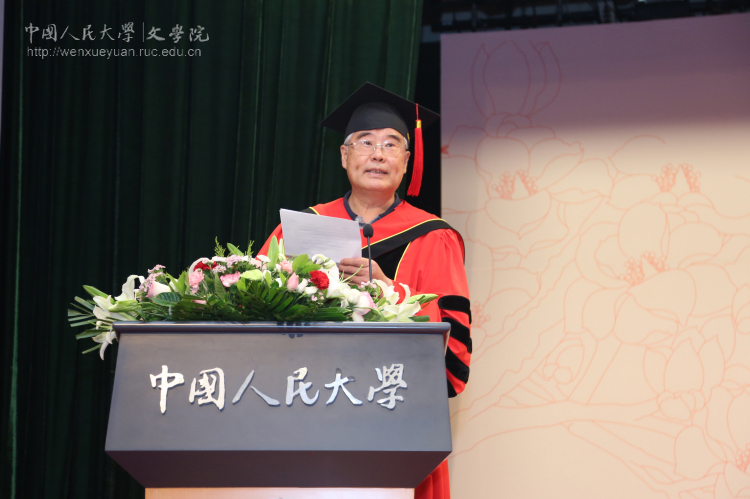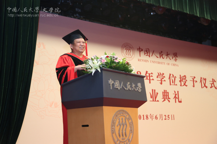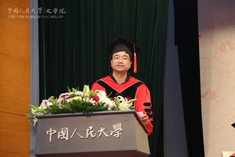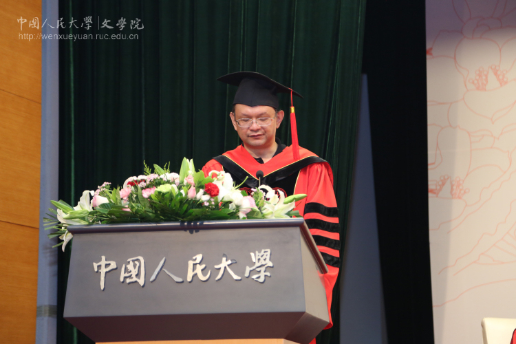 仪式进行第十项,香香腐宅 院长孙郁教授致辞。他告诉毕业生们,禁不住质疑的学问是脆弱的,只有不断反诘和追问,方能丰富自己,同时要珍视老师们对于独立思考与精神突围的提示。接着,他表示,文凭不等于学问,在谙熟书本知识的同时,也要认真研读人间这部大书,在开阔的视域里,做一个有趣味的人;也要永远保持着对世界的好奇心和猜想,在辨析中坚守自我的同时关心“他人的自己”。最后,他希望同学们能在坚守中将梦变为现实,并祝福“世界会因你们而改变”。