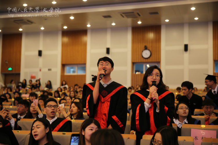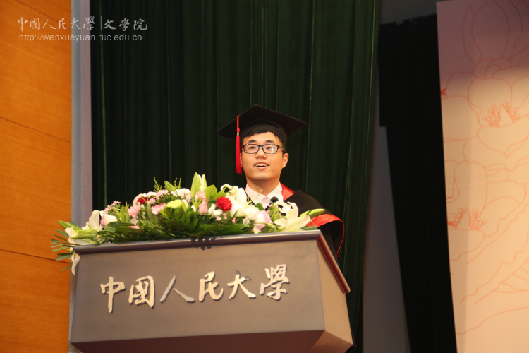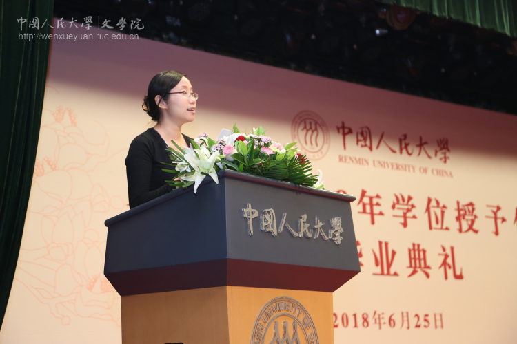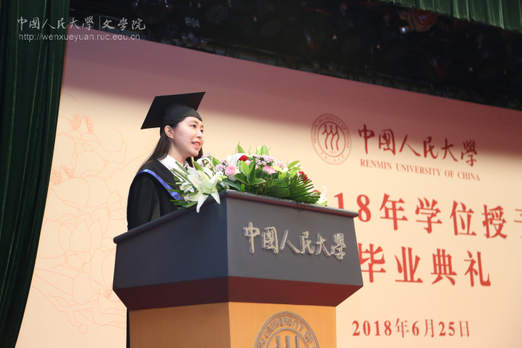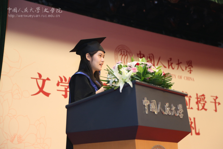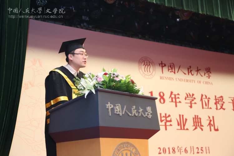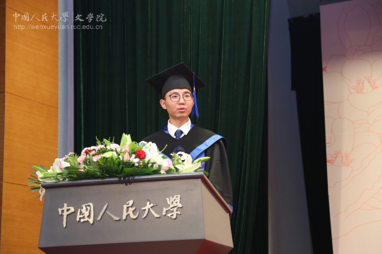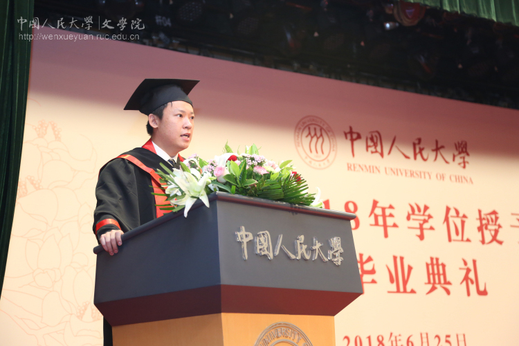 接着,香香腐宅 2018届本科生杨春萌、留学生刘政、学术型硕士王妍思、专业型硕士王永程和博士生雷欣翰相继作为毕业生代表发言。他们先后表达了对学校、学院的眷恋之情,对导师、同窗和挚友的感激之情,并表示,不论未来如何选择,将始终带着文院在自己生命中所留下的永恒烙印砥砺前行。