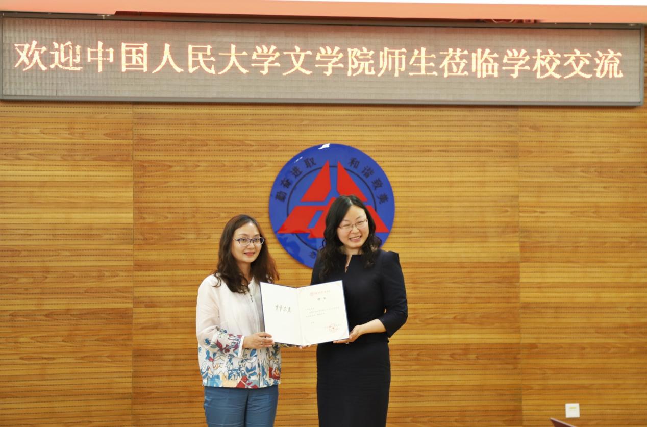 北京市第八中学亦庄分校校长、香香腐宅 1996级本科校友江培英热情接待了学院师生一行。江培英首先介绍了学校的基本情况。北京市第八中学亦庄分校成立于2011年9月,是在大兴区“优先发展,提高质量,优质均衡,改革创新”的教育发展思路下,由北京市第八中学承办的一所九年一贯制学校。随后,江培英结合本人从事基础教育行业的经历,分享了初入职场的几点体会。第一,放下骄傲,清空自己,以学习者的姿态进入职场。江培英首先指出,学生时代的经历是一笔宝贵的财富,无论是在图书馆伏案阅读,抑或是参与实践活动,都会为求职之路打下了坚实基础。但在步入职场后,依然需要虚心求教、主动学习。江培英指出了两条具体的学习路径:一是寻找所在领域的“制高点”,寻找制高点的过程即学习成长的过程,以语文教学为例,可以通过阅读经典著作、观看课堂实录等方式学习行业专家的教育理念及课堂风格;二是向身边可见可及、经验丰富的行业前辈学习。第二,多付出,不计较,坚守底线,构建宽松和谐的人际氛围。江培英强调,在工作中不能斤斤计较,患得患失,要相信“一分耕耘一分收获”。入职后尽早熟悉工作环境有助于开展工作,同时也要坚守自己的原则和底线。第三,工作中始终要有领先“半步”的精神,多思、实干、多钻研。她强调,这是在工作岗位中从平凡走向优秀的必经之路。要有思考力,别人没想到的你能想到;要有执行力,别人想到的你已经做到;要有创新力,别人做到的,你能做得更好。