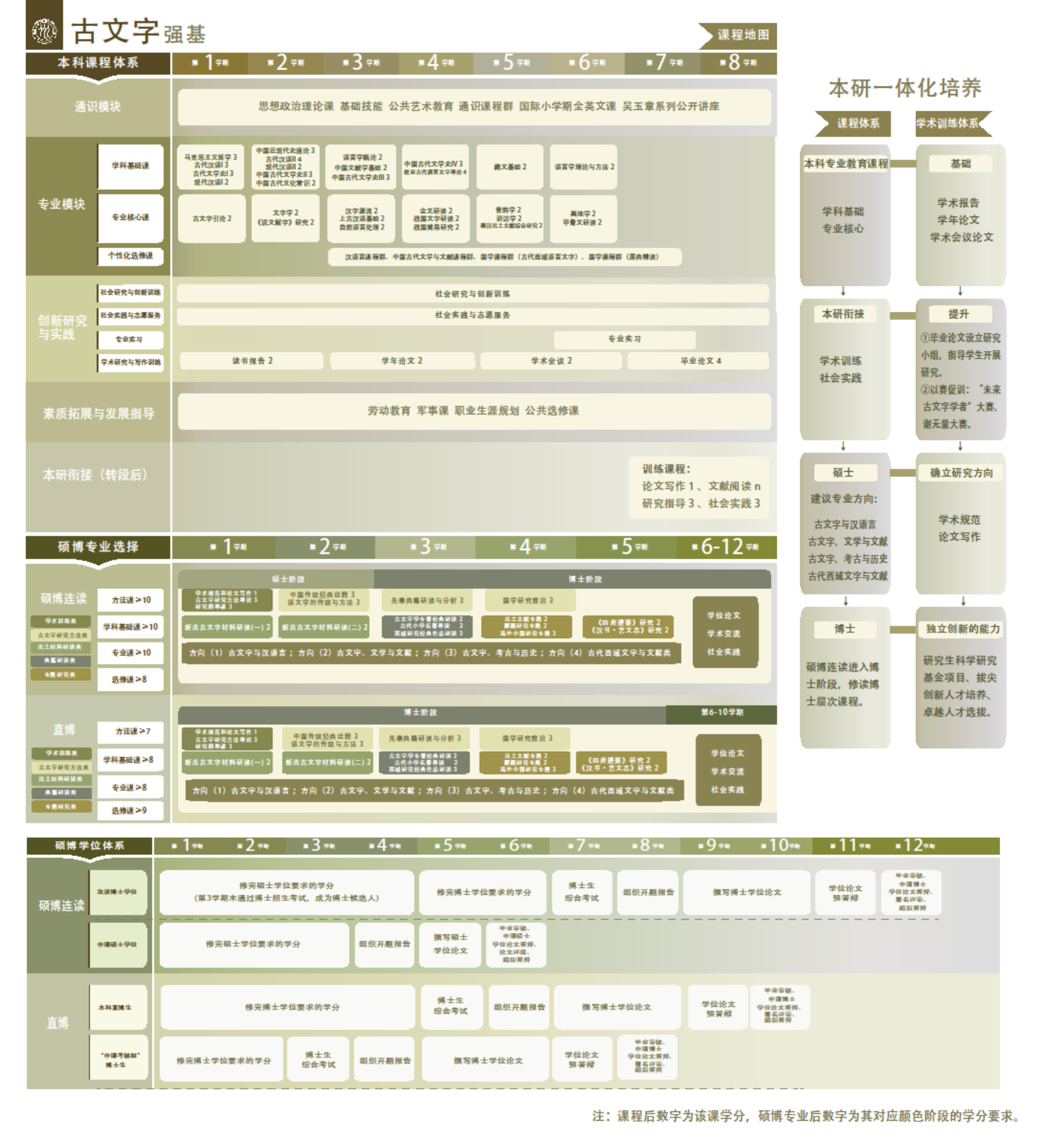 在本科第四年的“本研衔接”阶段,通过转段考核的学生需修读“论文写作”“文献阅读”“研究指导”和“社会实践”训练课程,为更好地进入研究生阶段打下坚实基础。研究生培养方案(硕博连读或直博)包括学科基础课、方法课、专业课和选修课四种,课程根据内容又分为学术训练类、古文字研究方法类、出土材料研读类、典籍研读类和专题研究类,在大量科研实践、读写实训、专题实研中培养和提升学生的科研能力,锻造古文字学术拔尖人才。