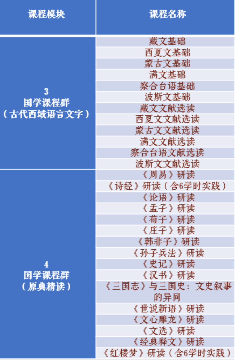 在“学科基础课”中,全面覆盖语言学(古代汉语、现代汉语、语言学概论)、考古学(中国考古学)、古典文献学(中国文献学基础)、古代文学(中国古代文学史)、历史学(中国通史)、哲学(中国哲学史)等学科门类。“专业核心课”重视古文字相关核心课程结构完整、层次清晰(古文字引论、《说文解字》研究、汉字源流、欧亚古代语言文字导论)、重点突出(甲骨文研读、金文研读、战国文字研读、战国简帛研究、秦汉出土文献综合研究)的同时,不忘夯实相关传统核心课程,包括文字学、训诂学、音韵学、舆地学、出土文献综合研究、先秦典籍研读、语言理论与方法、自然语言处理等。“个性化选修课”开设“汉语言”“中国古代文学与文献”“古代西域语言文字”“国学原典”四个课程群,为学生提供研究方向的个性化选择。
